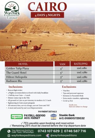 • Return flight tickets (Nairobi – Cairo – Nairobi)